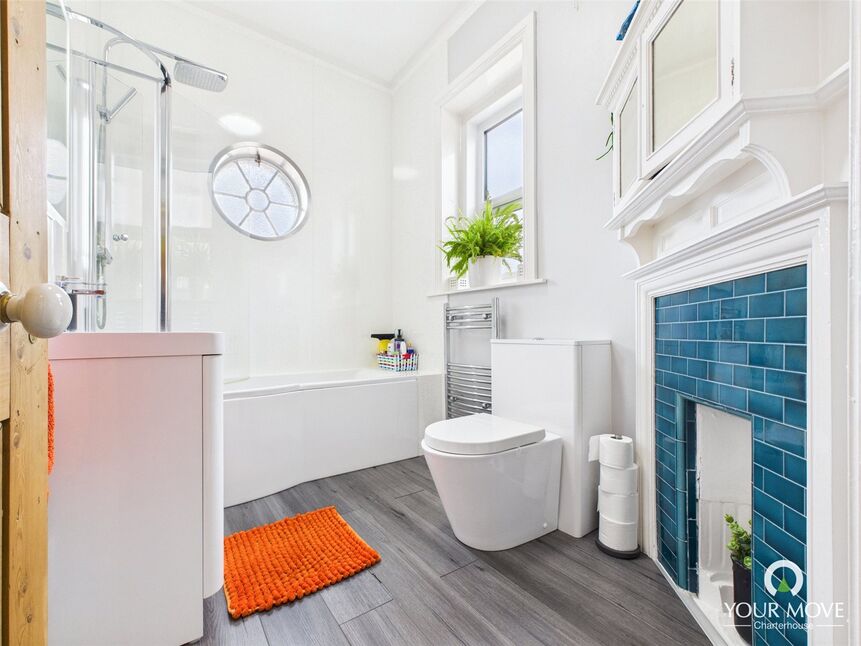 Double glazed obscured window to the side, obscured port hole window to the front, P shaped bath with rainfall shower over plus further shower head, close coupled WC, feature tiled fireplace, laminate flooring, sink into gloss white vanity with mirror, light and shaver over, heated chrome towel rail, wall mounted electric heater.