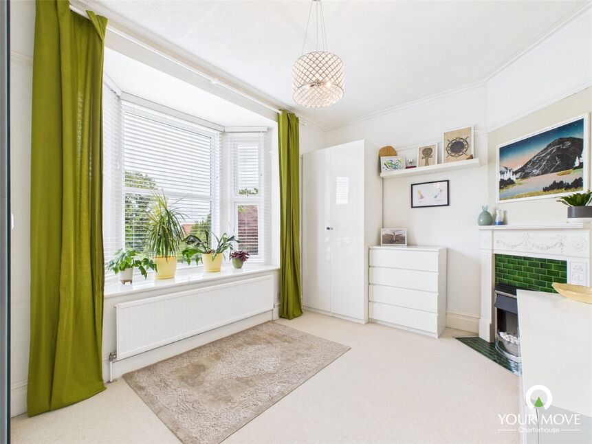 Double glazed French doors to the balcony, feature tiled fireplace, carpeted, radiator, coving, picture rail, telephone point.
