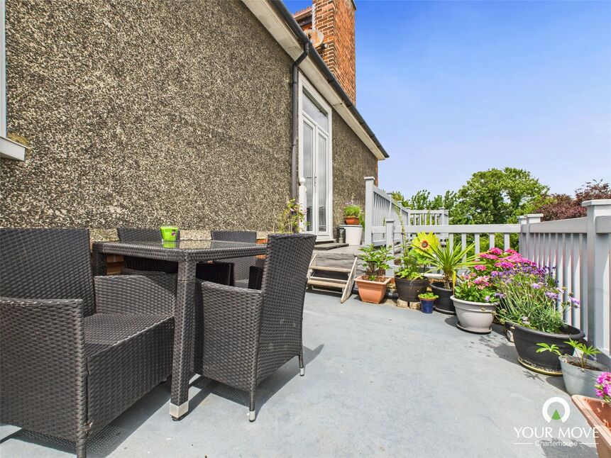 Runs along the side of the property with a non slip coating, plenty of space for outside seating, perfect for morning sun.