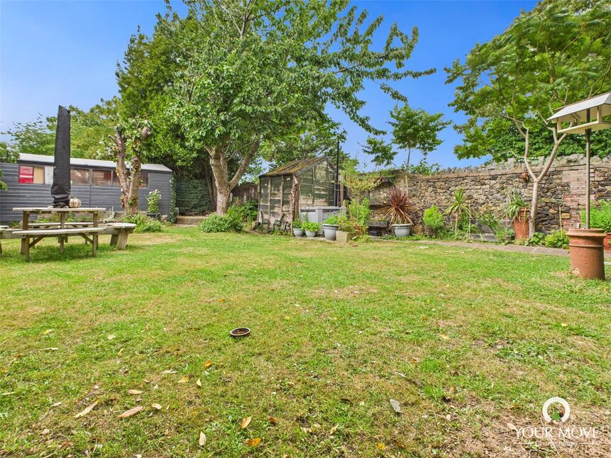Gated side access to a private enclosed rear garden which is walled and fenced, with a large shed with power plus further storage shed, opening to lawned area with mature plants, shrubs, trees and pond, hardstanding area where a hot tub was placed with water supply.