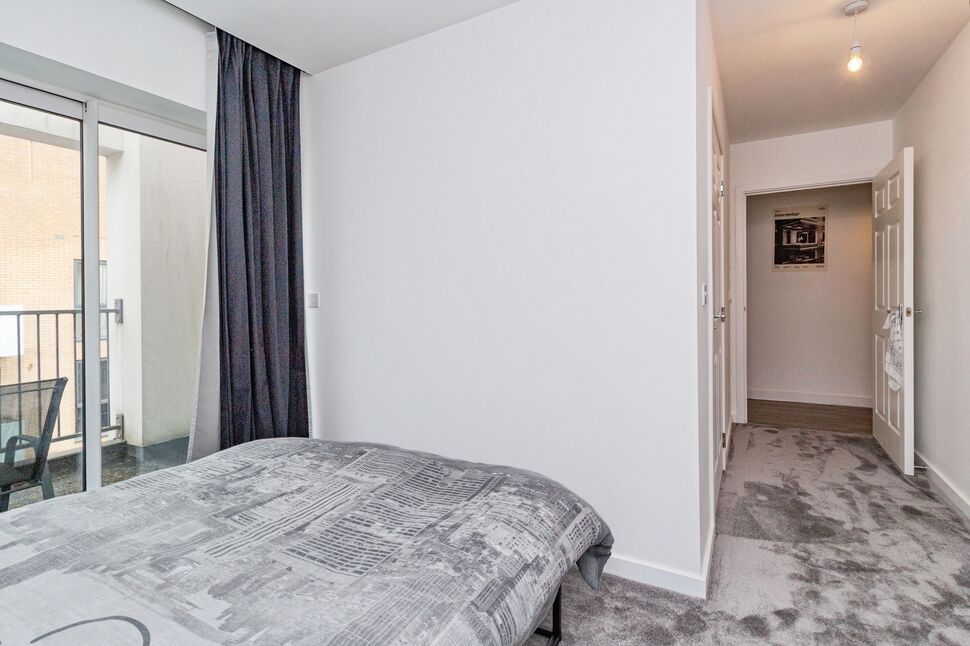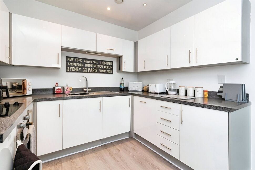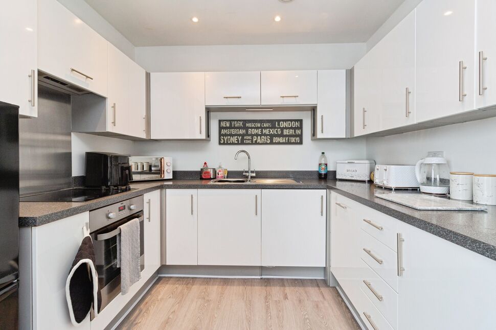 Offering access to two balconies and open access into kitchen area that features a range of wall and base units, space and plumbing for appliances, integrated electric oven, hob, extractor hood and sink with drainer and mixer tap.