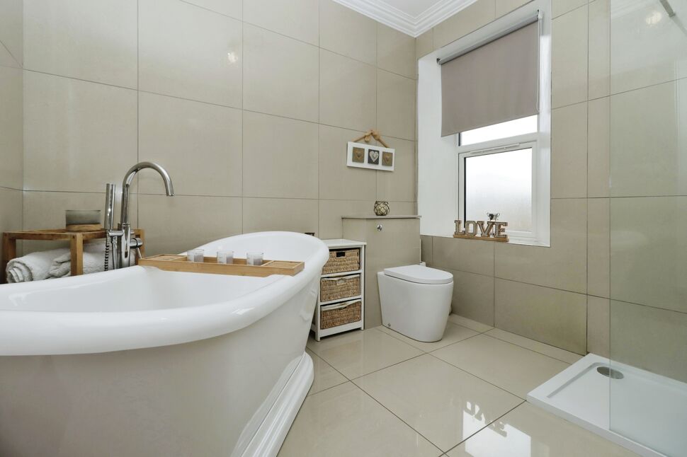 Renovated to a very high standard with a feature roll top bath, separate walk in shower with rain head shower and floor to ceiling tiles.