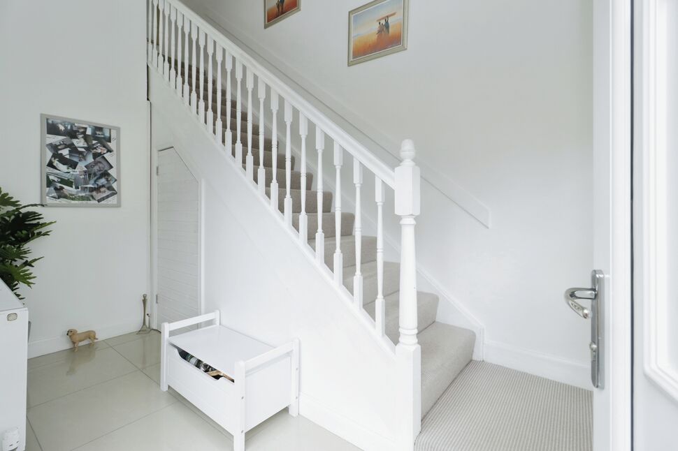 Bright entrance hall with under stair storage & utility space and stairs leading up to the main residence.