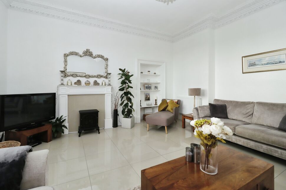 A large living room to the front of the property, flooded with natural light and tastefully decorated whilst also retaining a lot of the original features like the cornicing.
