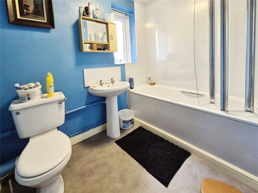 Three piece suite comprising of panelled bath with shower fitted over, low level WC, pedestal wash hand basin, double glazed frosted window to rear aspect, radiator.