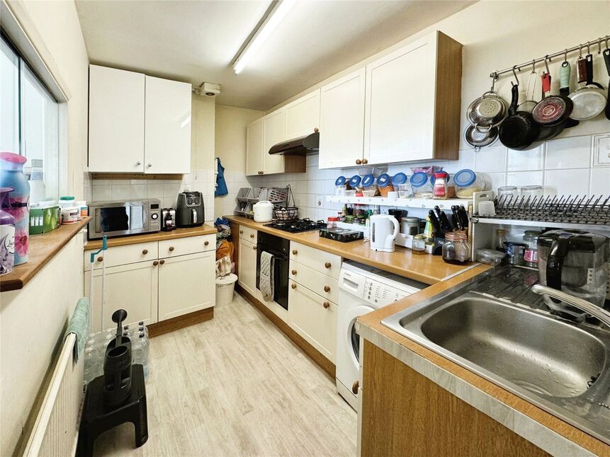 Vinyl flooring. Single radiator. Part tiled walls. The kitchen comprises a range of wall and base units with a rolled edge worksurface over and a stainless steel sink and drainer inset. Fitted oven, gas hob and extractor. Space for washing machine. Large serving hatch with glass sliding doors to lounge/diner.