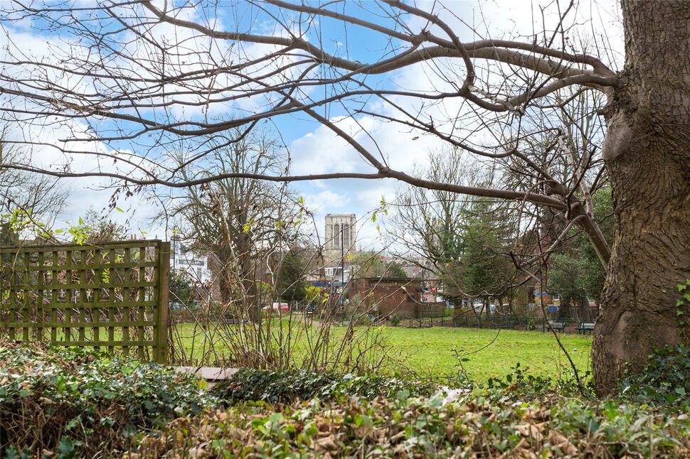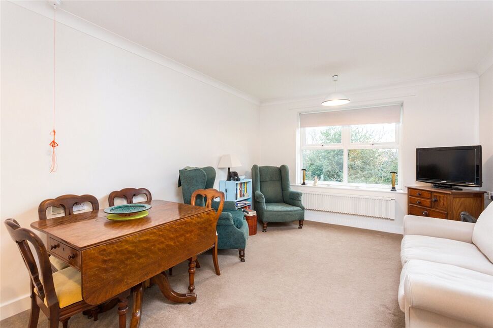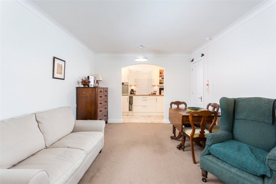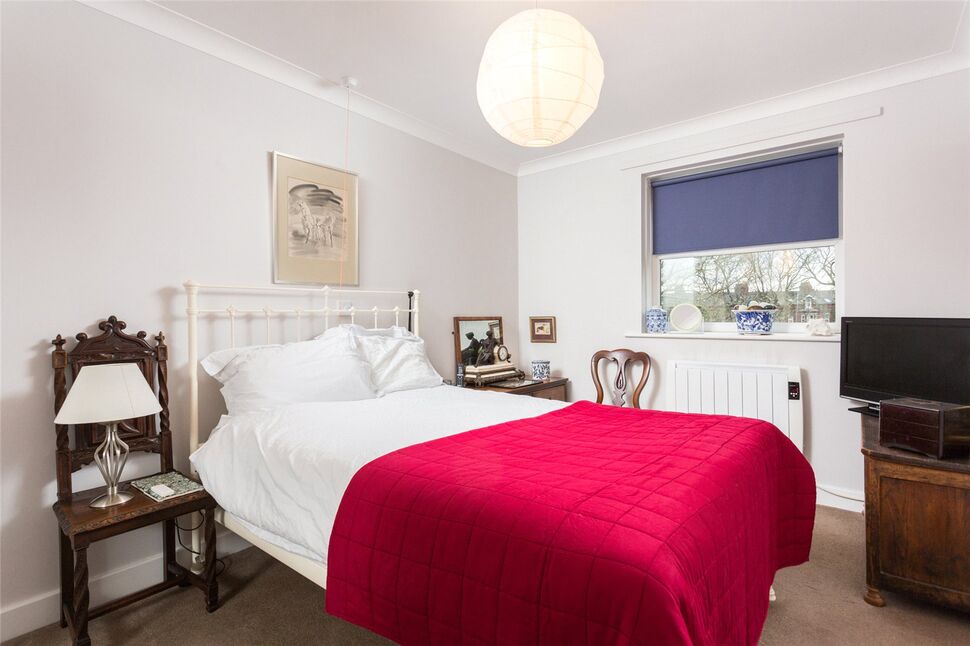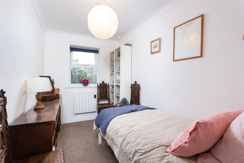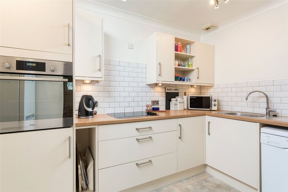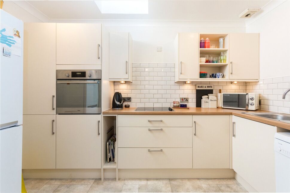 Once inside the apartment, the entrance hallway has two large storage cupboards with one housing the hot water tank. The lounge/dining room has a large window at one end overlooking the communal garden and adjacent park. At the other end is an opening into the kitchen which is flooded with light from an overhead skylight and is fitted with a range of wall and base units with wood effect worktops, tiled splashbacks, an electric hob, electric oven/grill, and spaces for a dishwasher and fridge/freezer.