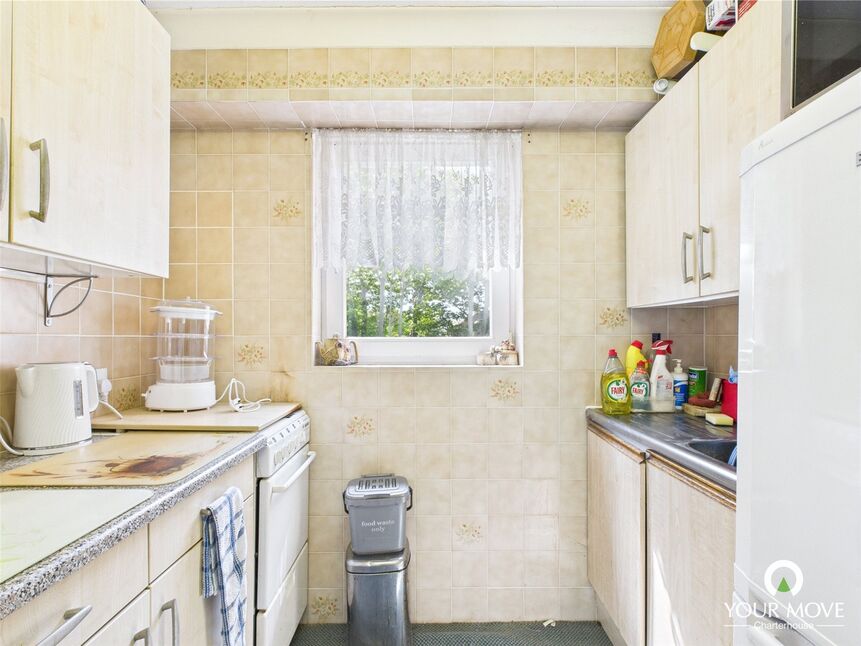 With a double glazed window, coved and textured ceiling, a stainless steel sink unit with mixer tap set in worktop with a selection of cupboards, drawers and wall cabinets. Freestanding electric cooker and fridge/freezer.
