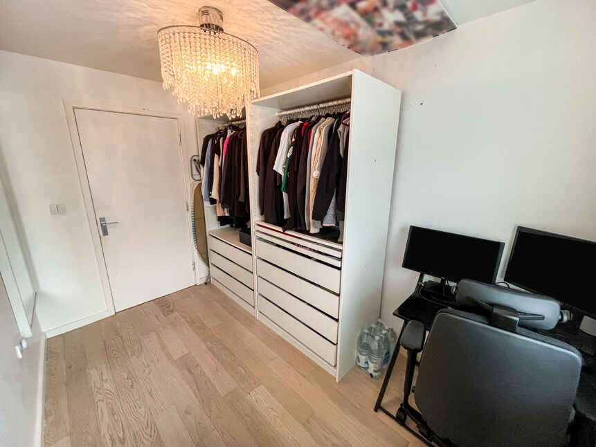 The property features two good size bedrooms, offering ample space for rest and relaxation, the first is a double with space for wardrobes, and the second is currently set up as a dressing room/home office.. The modern shower room comes equipped with a mains shower, W/C, and hand basin, combining functionality with contemporary style.