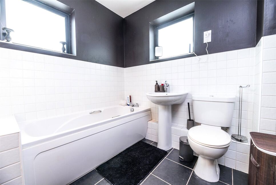 Full size en-suite featuring a panel bath, low flush toilet, tiled splashbacks, tiled flooring, electric radiator and a double glazed window to the side and rear aspects.