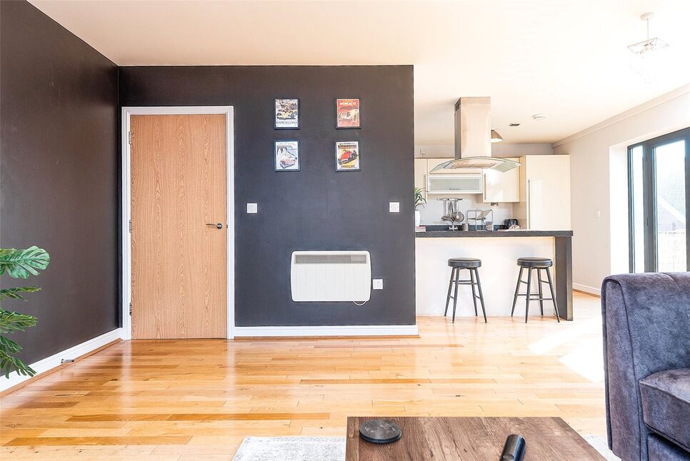 Light and spacious modern living/kitchen space boasting a range of fitted wall, base and drawer units, breakfast bar, contrasting work surfaces and inset sink/drainer. Additional features include an integrated hob and oven with extractor, integrated fridge freezer, space for dishwasher, wood effect flooring, electric radiator, TV point, double glazed French doors providing access to the balcony and a double glazed window to the front aspect.