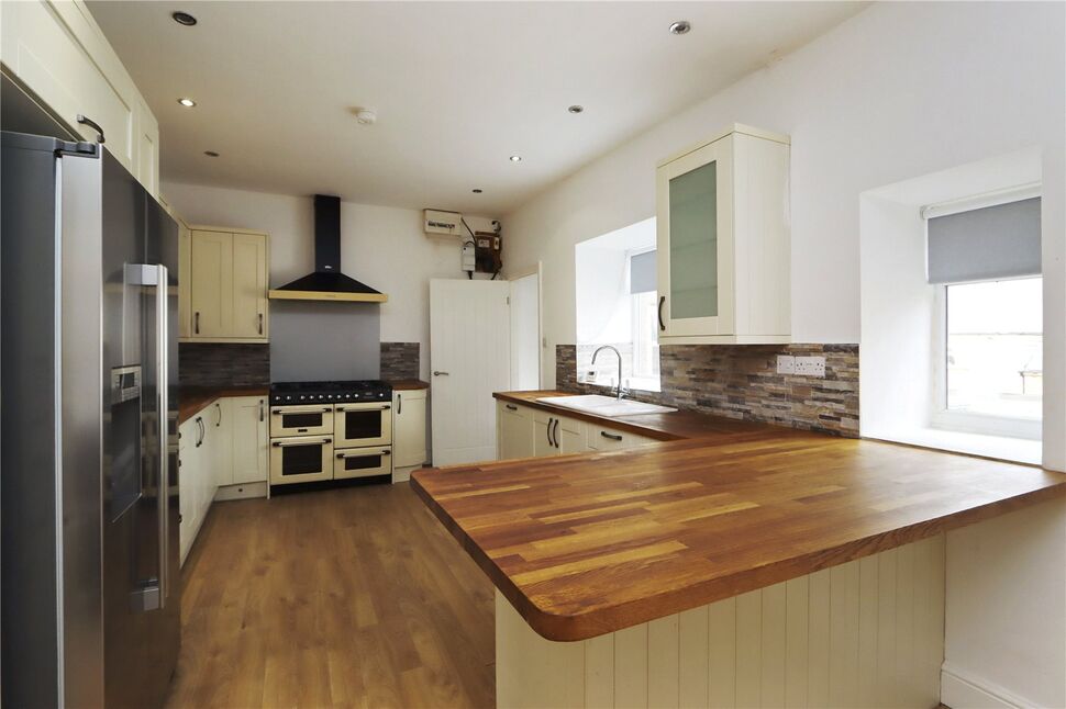 With UPVC double glazing and gas central heating, the apartment is accessed from the rear, via Wardle Terrace, with a ground floor entrance lobby and store area, which houses the combi. boiler. Stairs lead up to the first floor, into the spacious kitchen/living room, which has laminate flooring and has a kitchen area fitted with cream wall and base units, wooden worktops and breakfast bar, a Range-style cooker, Neff free-standing fridge/freezer and integrated dishwasher. The lounge area offers a good amount of space and there are a few stairs up to the landing, leading to two double bedrooms and a wet room, which has a mains-fed shower.