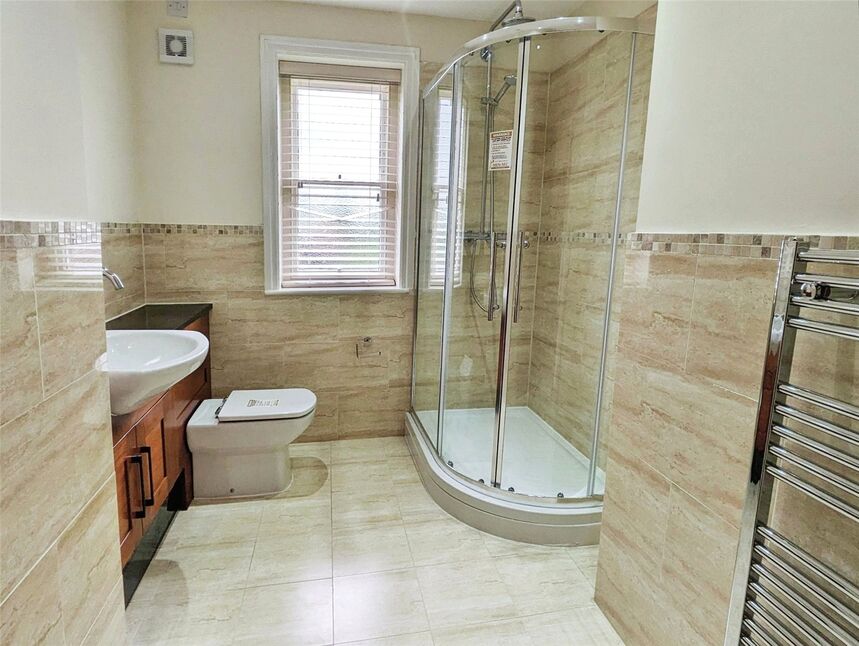 Comprising WC, wash basin, shower cubicle, radiator, double glazed window.