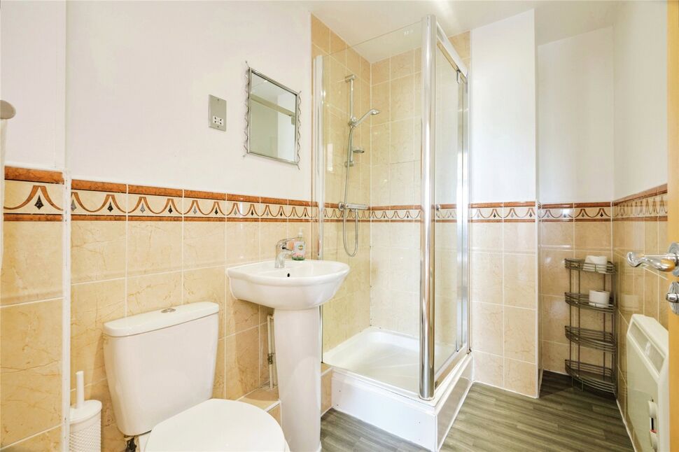With three-piece contemporary shower suite, electric wall heater, part-tiled walls, and wood-effect flooring.