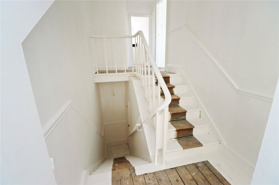 Wood door, stairs to first floor landing and stairs to rear, access to rear yard.