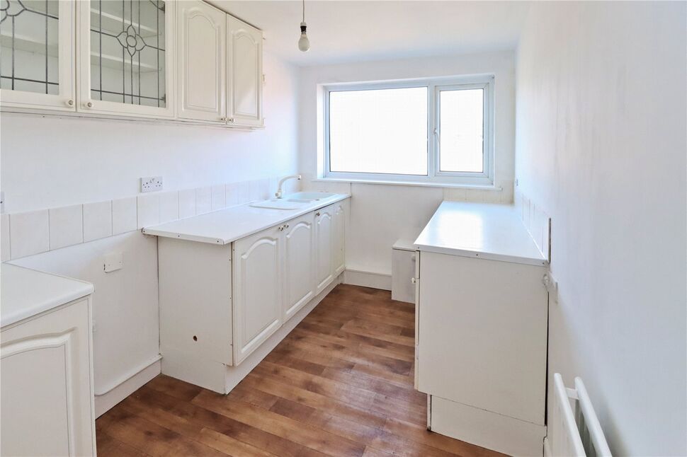 Fitted with a range of wall and base units and roll top work surfaces, gas cooker point, one and a half bowl sink and drainer, tiled splash backs, plumbed for washing machine, double glazed window to the front and radiator.