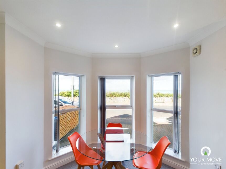 With a double glazed bay window to the front with sea views and fitted blinds, 2 radiators, carpeted, down lights, coving, extractor, TV and phone points, opening and step down to kitchen.