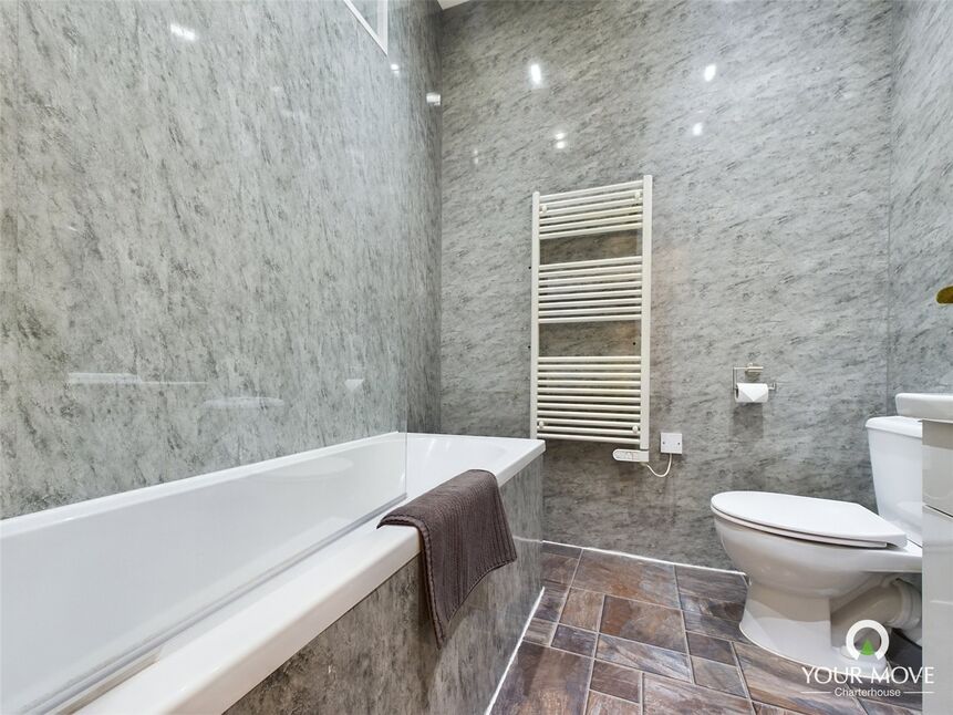 Panelled bath with shower over, heated chrome towel rail, wash basin into gloss white vanity unit, shaver point, close coupled WC, extractor, down lights, panelled walls.