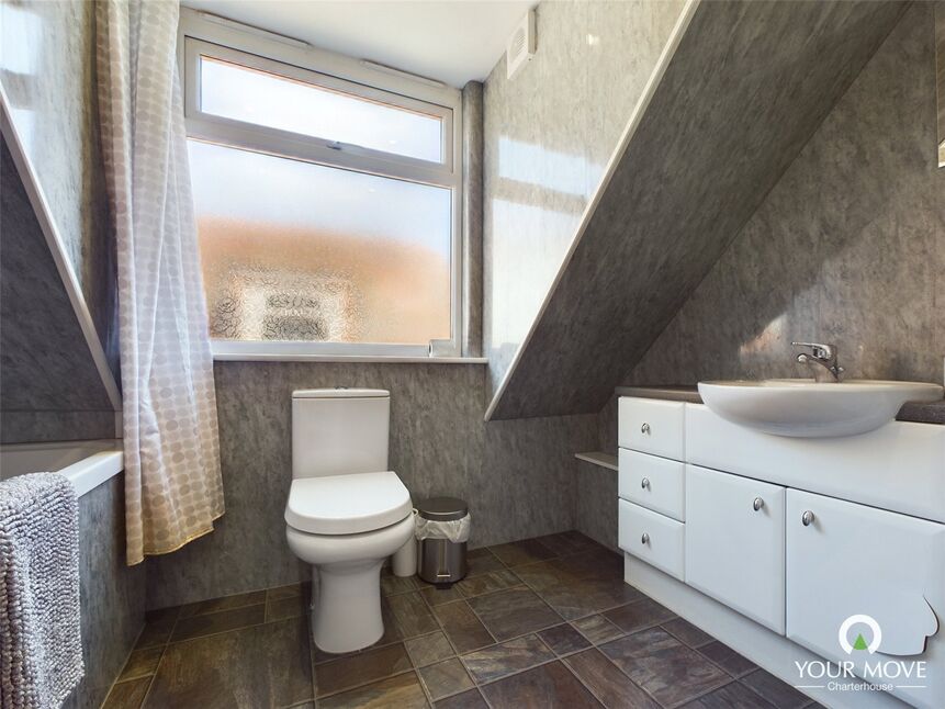 Double glazed obscured window to the side, panelled bath with shower attachment, sink into gloss white vanity, shaver point, close coupled WC, heated chrome towel rail, panelled walls, down lights, extractor.
