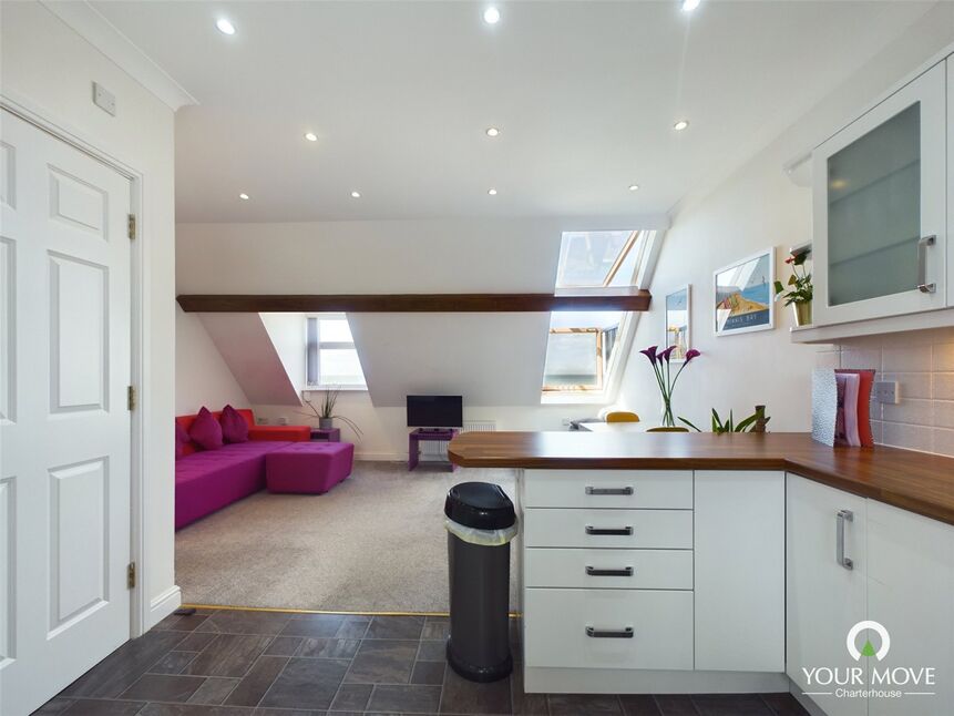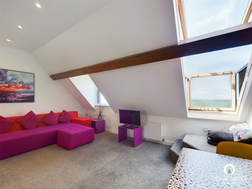 With a double glazed window to the front with sea views and fitted blind plus a double glazed Velux balcony window again with sea views, 2 radiators, carpeted, feature beam, down lights, coving, TV and phone points, open plan to kitchen.