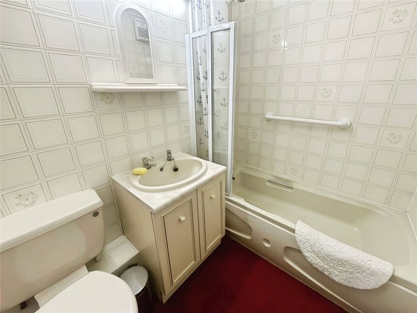 Carpeted floor and tiled walls, this bathroom benefits from vanity unit wash hand basin and LLWC, shallow panelled bath with eclectric shower attachment.