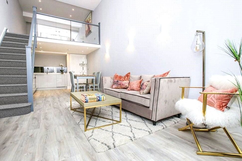 This style is really impressive with an amazing 14ft double height ceiling in the living room, a superb fully fitted kitchen with integrated appliances , a luxury fully tiled bathroom with a contemporary white suite and stairs up to a large galleried mezzanine level double bedroom.