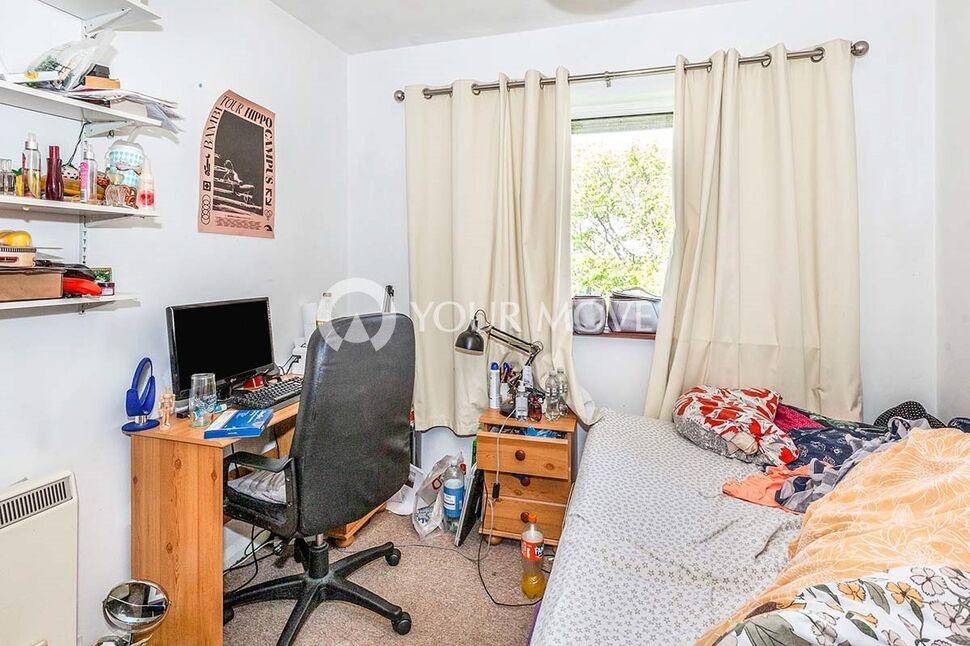 A good size bedroom with a bed, wardrobe, desk and chair.