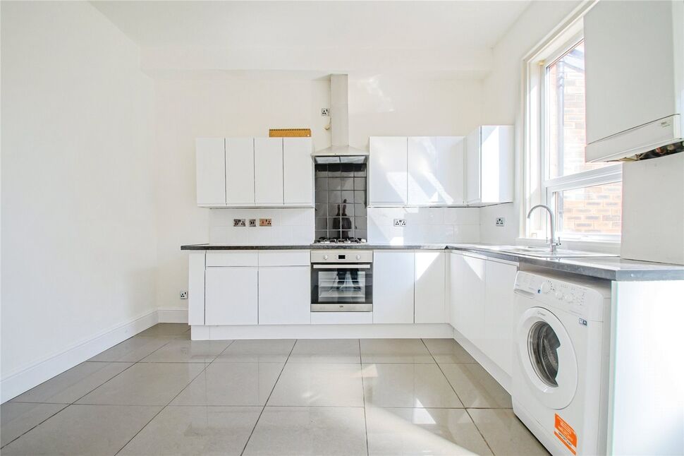 A modern range of wall and base units with a complementary work surface, tiled flooring and part tiled elevations, integrated oven and hob, spaces for appliance's, single drainer and sink with a mixer tap, boiler, uPvc double glazed window and composite door to the rear elevations, radiator.