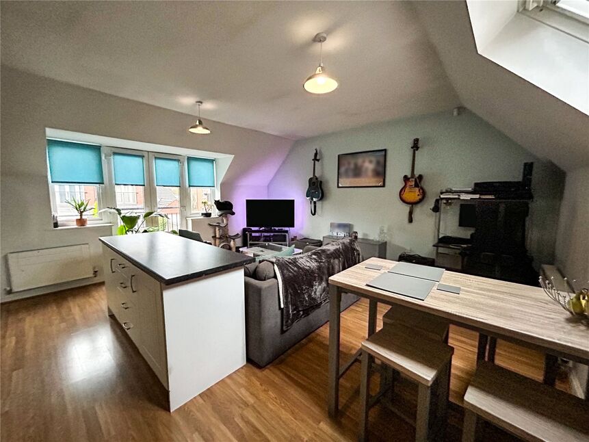 A light and airy space with double glazed windows and roof windows to the front and rear with wooden flooring. The kitchen area is fitted with a range of wall and base units with worksurfaces and tiled splashbacks incorporating stainless sink with mixer taps, hob with extractor and oven integral washing machine and dishwasher. Further base units with additional preparation worksurfaces. There are two zoned area with dining area and lounge. Juliette balcony