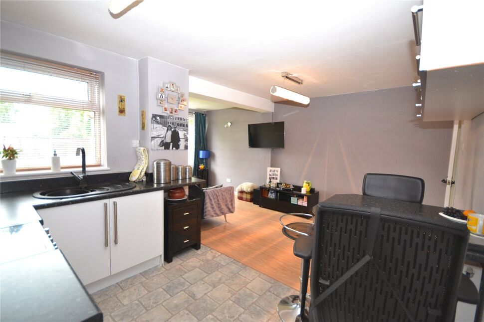 Space for washing machine, tumble dryer and fridge/freezer. Floor and wall units and a door leading to the rear garden.