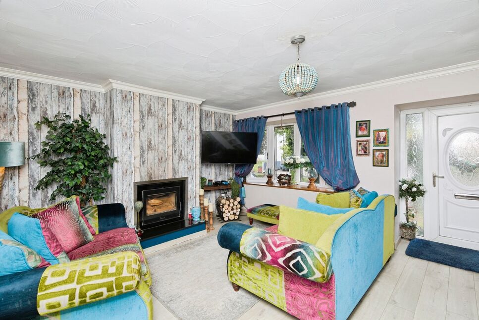 Spacious family lounge with a feature log burner. Stairs lead off to the first floor.