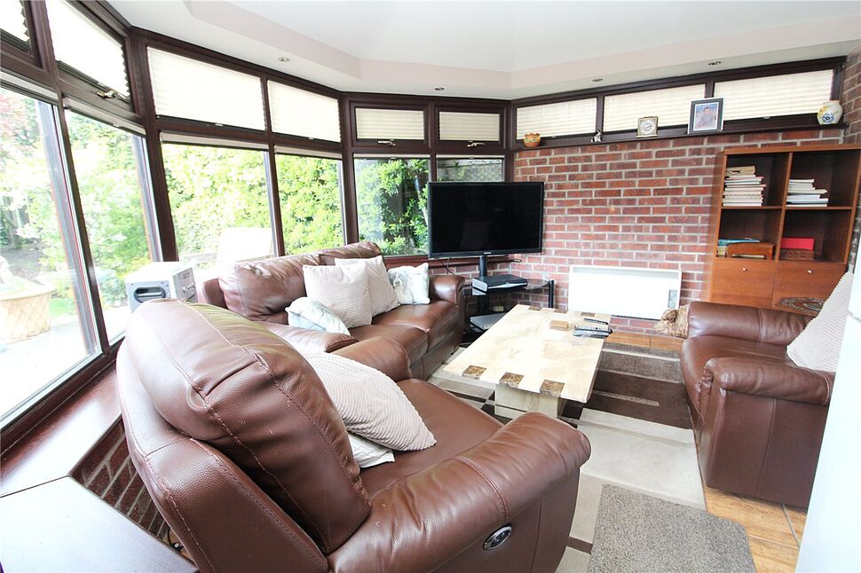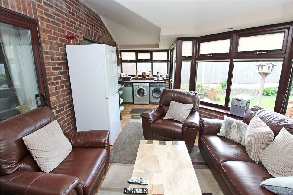 A versatile 'P' shaped conservatory, with a sitting area and a utility area with washer and dishwasher plumbing, French doors leading out to the rear garden.