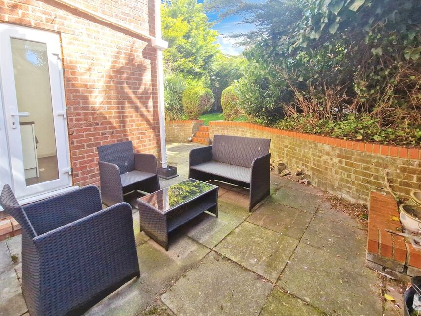 Secluded family garden with patio seating area, lawn and mature shrub and tree borders.