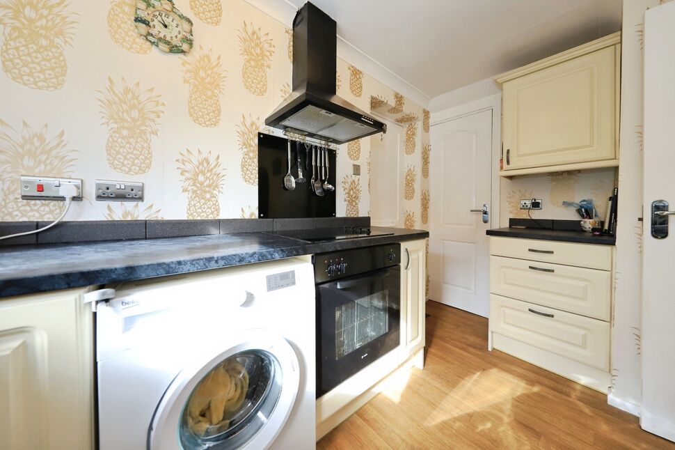 Modern wall and base units with surfaces over, built in hob, oven, extractor fan, space for other appliances, double glazed window understairs storage cupboard.
