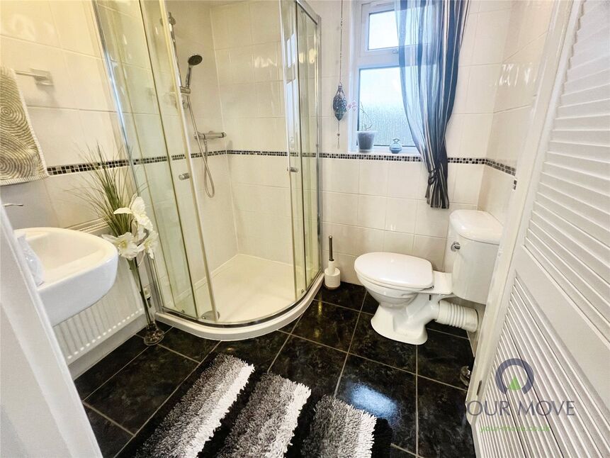 Having obscure double glazed window to rear, radiator, suite comprises, shower cubicle and fitted shower, wash hand basin, low level WC, cupboard having 'Worcester Bosch' boiler, complimentary tiling.