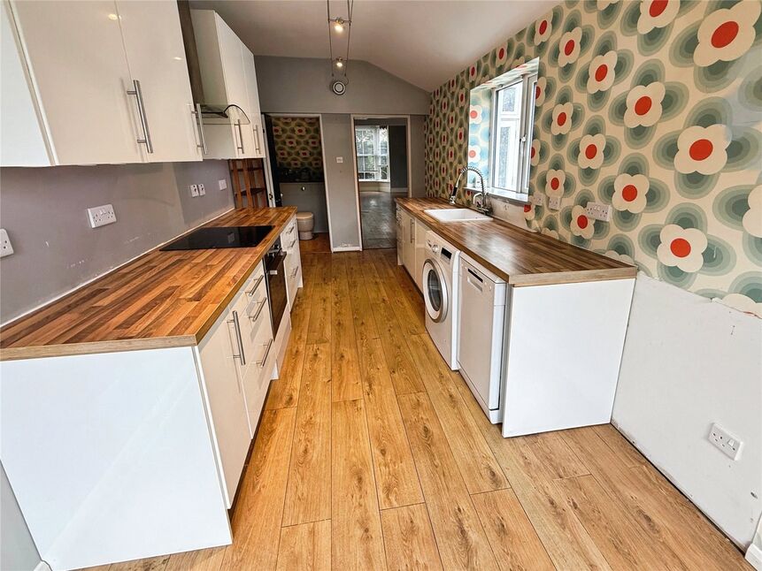 Being fitted with a range of eye level wall and base units with contrasting work surfaces fitted over, electric oven with 4 ring electric hob with stainless steel extractor hood over, ceramic sink with drainer and mixer tap over, double glazed window to side aspect, bi-folding doors to rear aspect, space for fridge freezer, space and plumbing for washing machine.