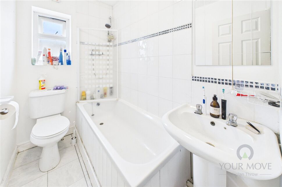 The bathroom features a clean, modern suite with a bath and shower over, plus a heated towel rail and tiled finishes for a fresh, contemporary look.