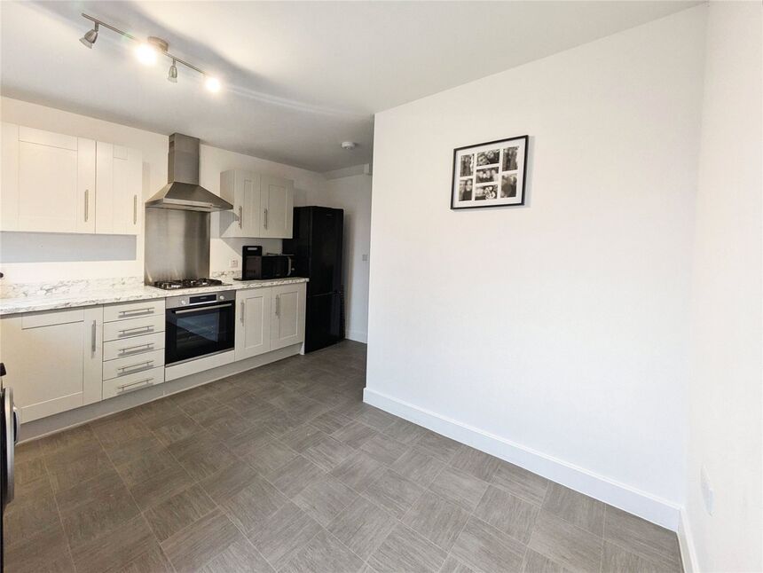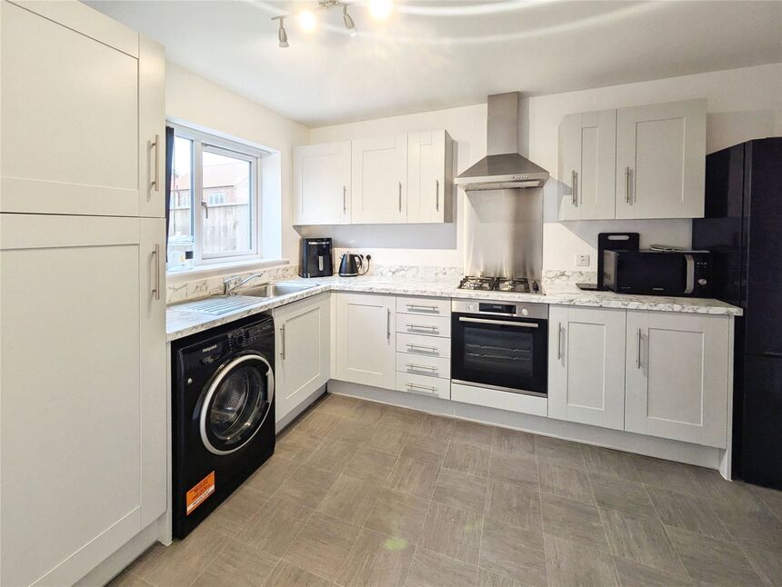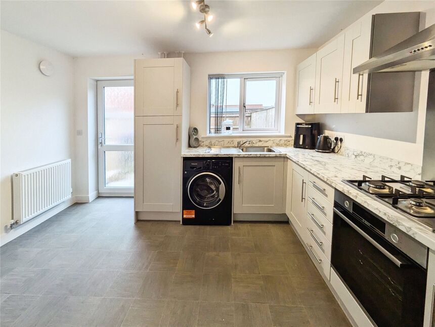 Modern fitted kitchen-diner comprising a range of wall and base units with contrasting work surfaces, sink and drainer unit, space and plumbing for a washing machine and dishwasher, integral oven and four ring gas hob with overhead extractor hood, wall mounted central heating boiler, radiator, space for dining furniture, double glazed window to the rear aspect and a uPVC double glazed door to the rear aspect.