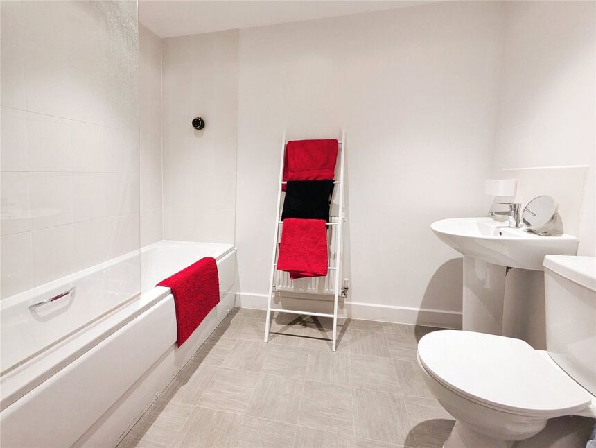 Modern bathroom suite comprising a panelled bath with overhead mains shower, low level WC, pedestal wash hand basin, radiator, shaver point, extractor fan and tile splashbacks.