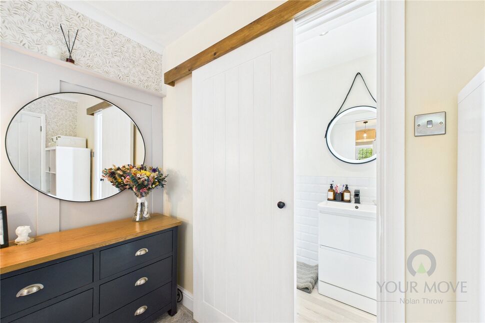 Leading upstairs, via the open-plan hallway, there are three good-sized bedrooms that all accommodate double beds as well as the family bathroom. Two of the bedrooms have fitted wardrobe space and overlook the front and rear. The beautiful family bathroom features a three piece suite with a crittall panel as well as a vanity unit. The main bedroom spans the length of the house and boasts panelling, wall sconce lighting and a sliding door to the en-suite. The en-suite has dual windows and has been lovingly fitted to feature character tiles, a double shower and vanity unit and is spotlighted throughout.