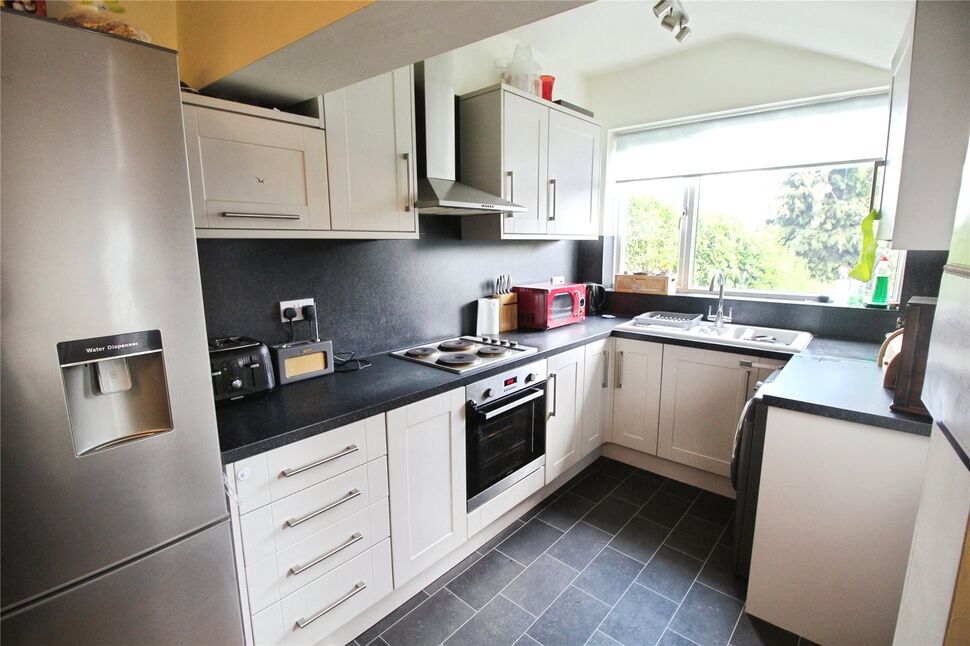Fitted with matching range of white wall and base units with roll edge work surfaces and matching upstands. There is an integrated electric hob with extractor over and oven below, sink with drainer and mixer tap over and space for washing machine and fridge/freezer. There is a window to the rear in an elevated position giving stunning views over the rear garden. A door to the side leads to the outside.