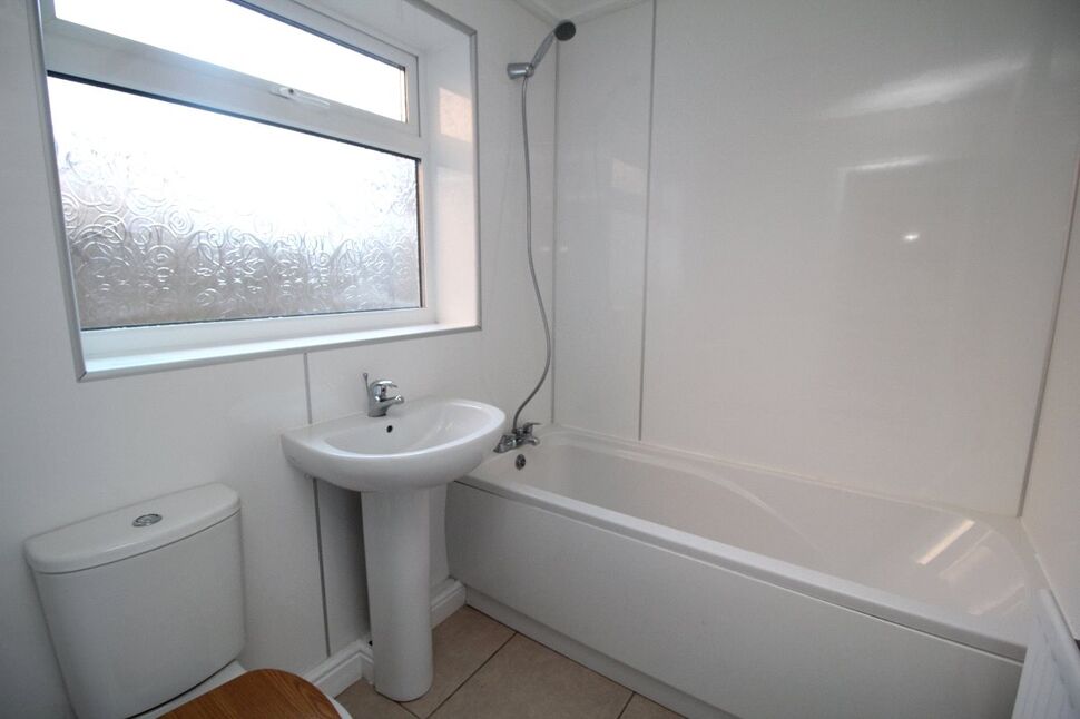 Ground floor three piece white suite with bath, handheld shower connection via taps, shower boards, sink, WC and floor tiling.