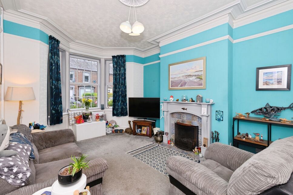 Generous living room with bay window and open fire incorporating decorative tiling and wooden style surround.
