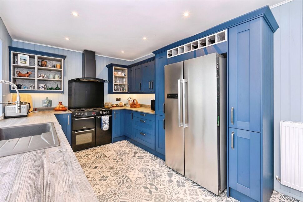 A range of wall and base units with contrasting worktops, range style dual fuel oven and gas hob, space for fridge/freezer and washing machine, sink, storage cupboard, floor tiling and door leading out to rear yard.