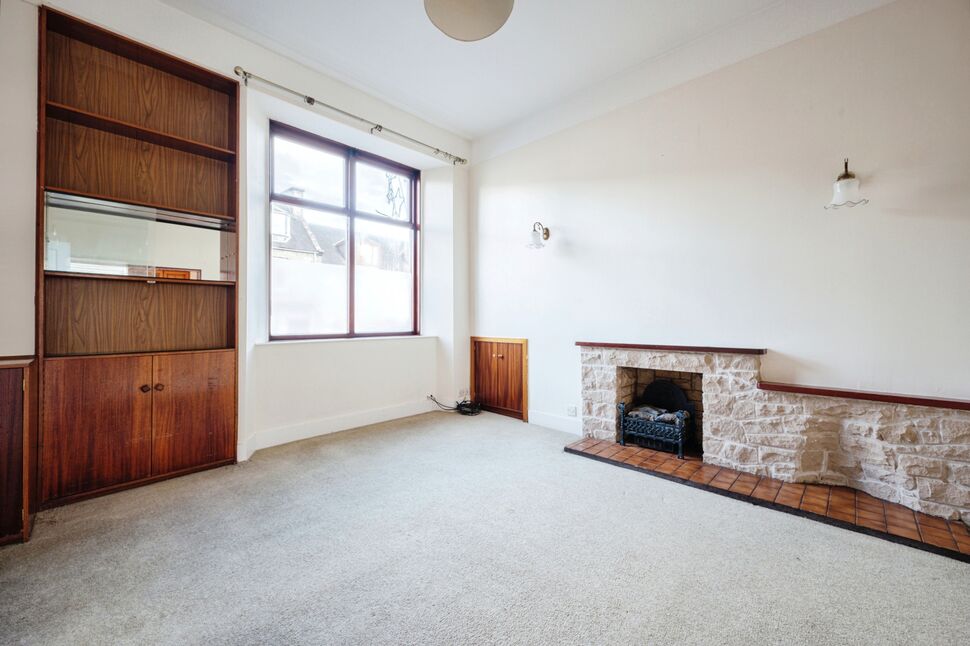 There’s a spacious, front facing, reception room boasting a feature fireplace, built-in storage and hatch access to the kitchen.