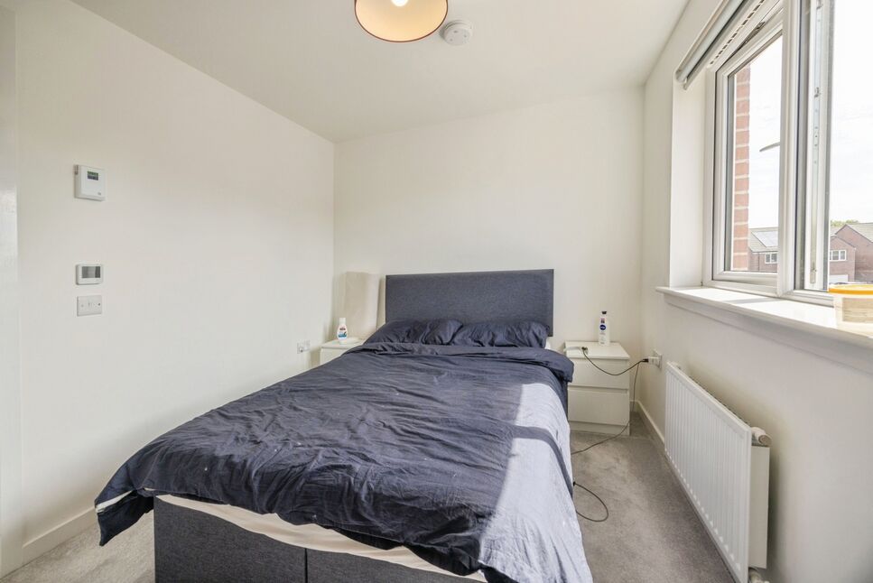 Comfortable bedroom with fitted wardrobes .Rear facing window