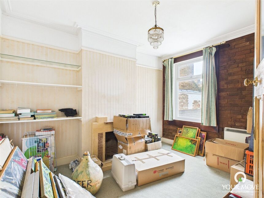 Double glazed bay window to the front, original coving, picture rail, ceiling rose, tiled fireplace, electric wall heater, alcove shelving, carpeted.
