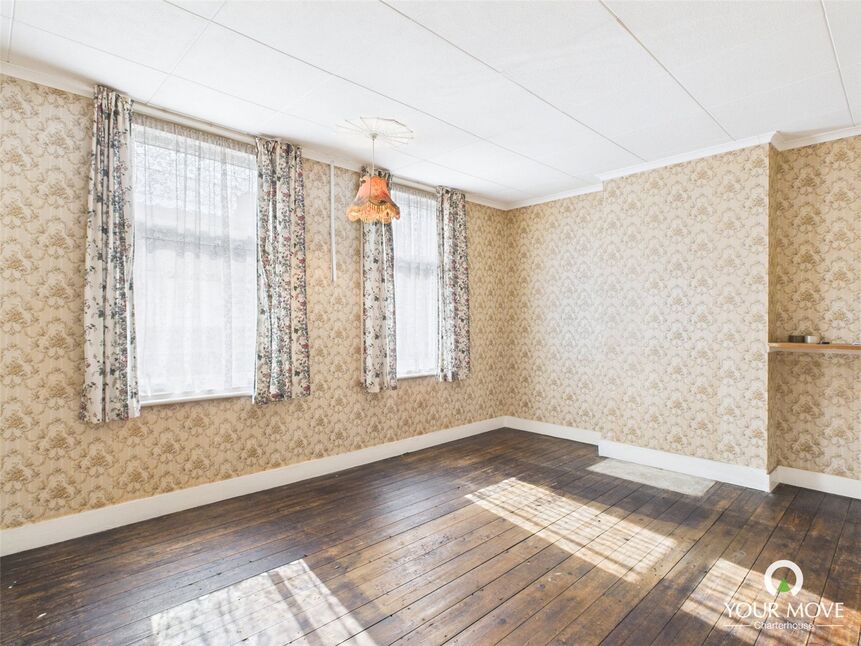 With a picture window to the side, original floor boards, coving, door to the basement.