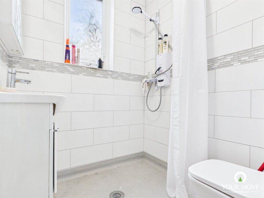 Double glazed obscured window to the side, non slip flooring with central drain, Mira electric shower, close coupled WC, wash basin into vanity unit with mirrored vanity over, tiled walls, heated chrome towel rail.