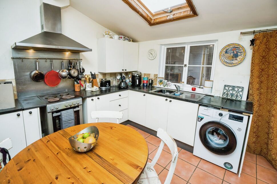 Fitted in a range of base & wall units, comprising sink unit with mixer taps, built in oven & hob, extractor over, plumbing for washing machine, radiator, double glazed skylight.